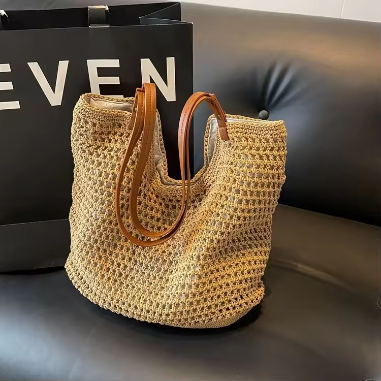 High-End Women's Large Capacity Casual Polyester Shoulder Bag New Cross-Border Fashion Open for Beach Vacation Handheld Straw
