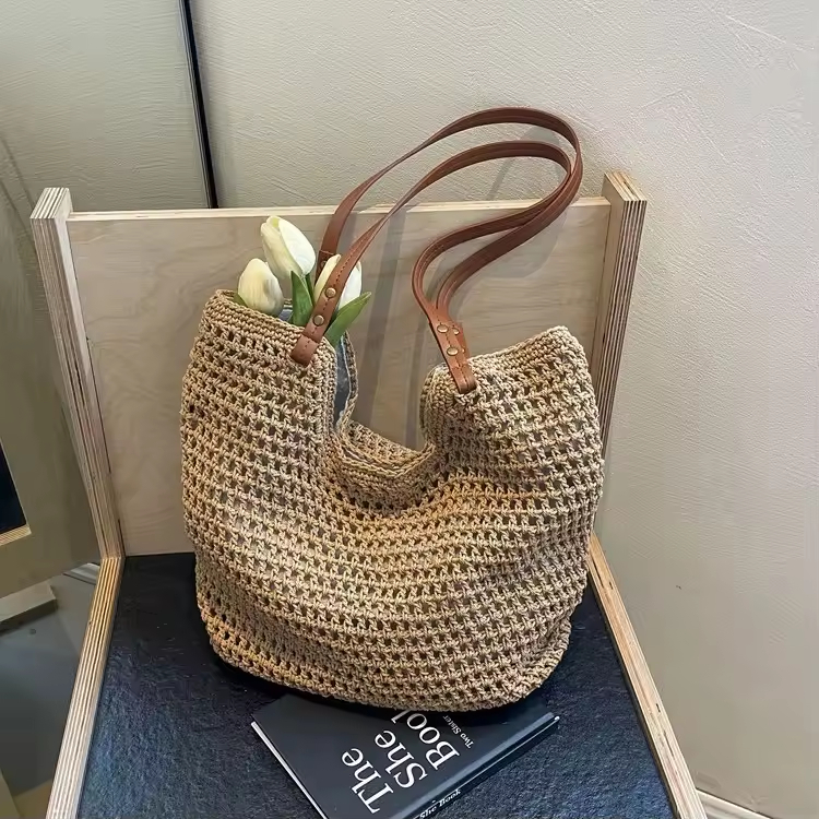 • High-End Women's Large Capacity Casual Polyester Shoulder Bag New Cross-Border Fashion Open for Beach Vacation Handheld Straw