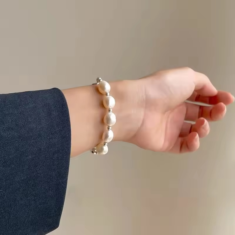 • S925 Sterling Silver Half Bracelet for Women High-End Baroque Niche Design Freshwater Pearl Beaded Bracelet Fashion Jewelry